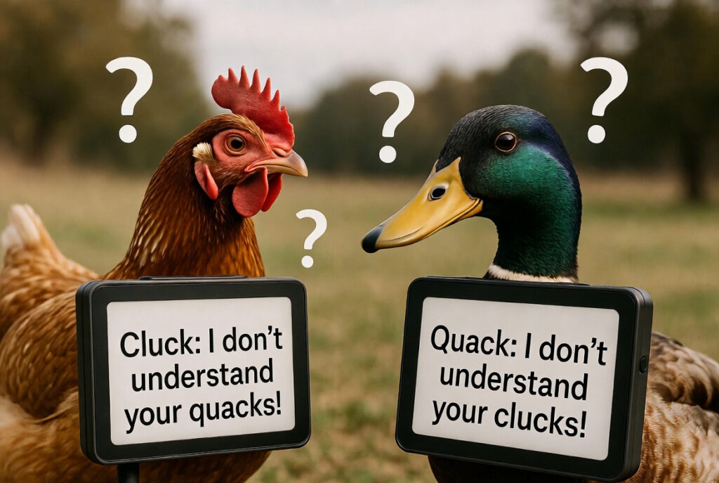 The Cantonese expression 雞同鴨講 translates to “Chicken-Duck Talk”.