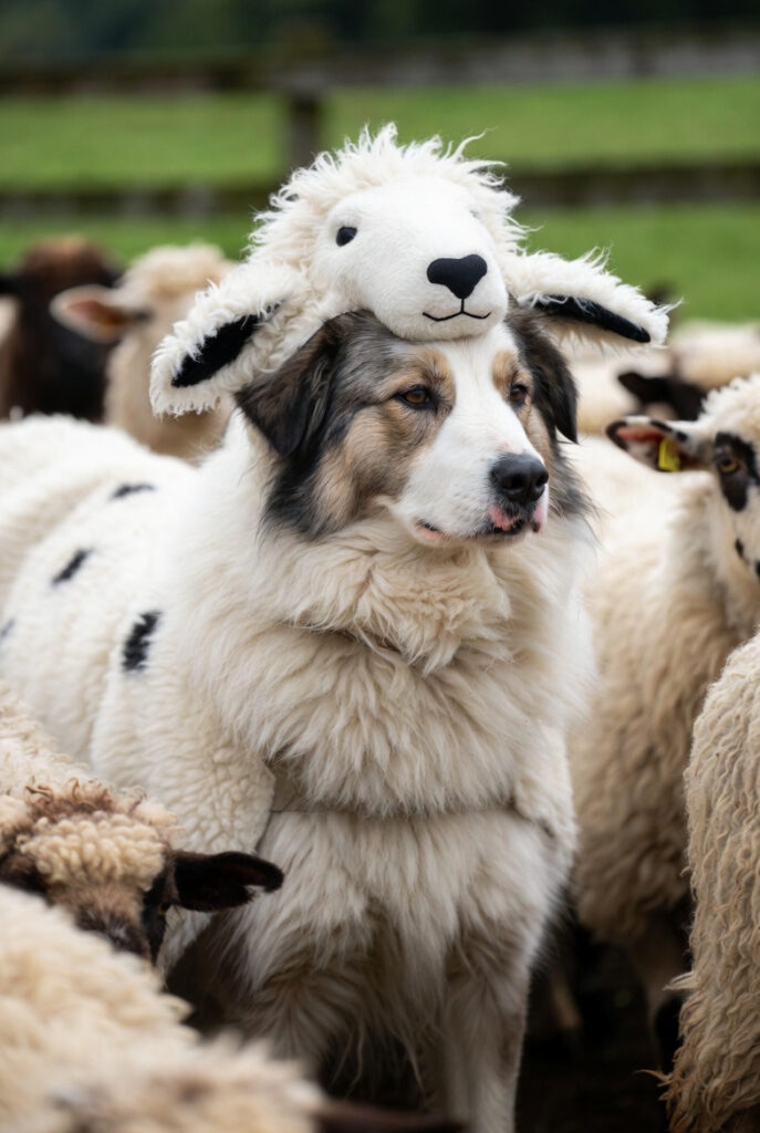 The sheepdog is part of the herd, but clearly not a sheep (and definitely not a wolf).